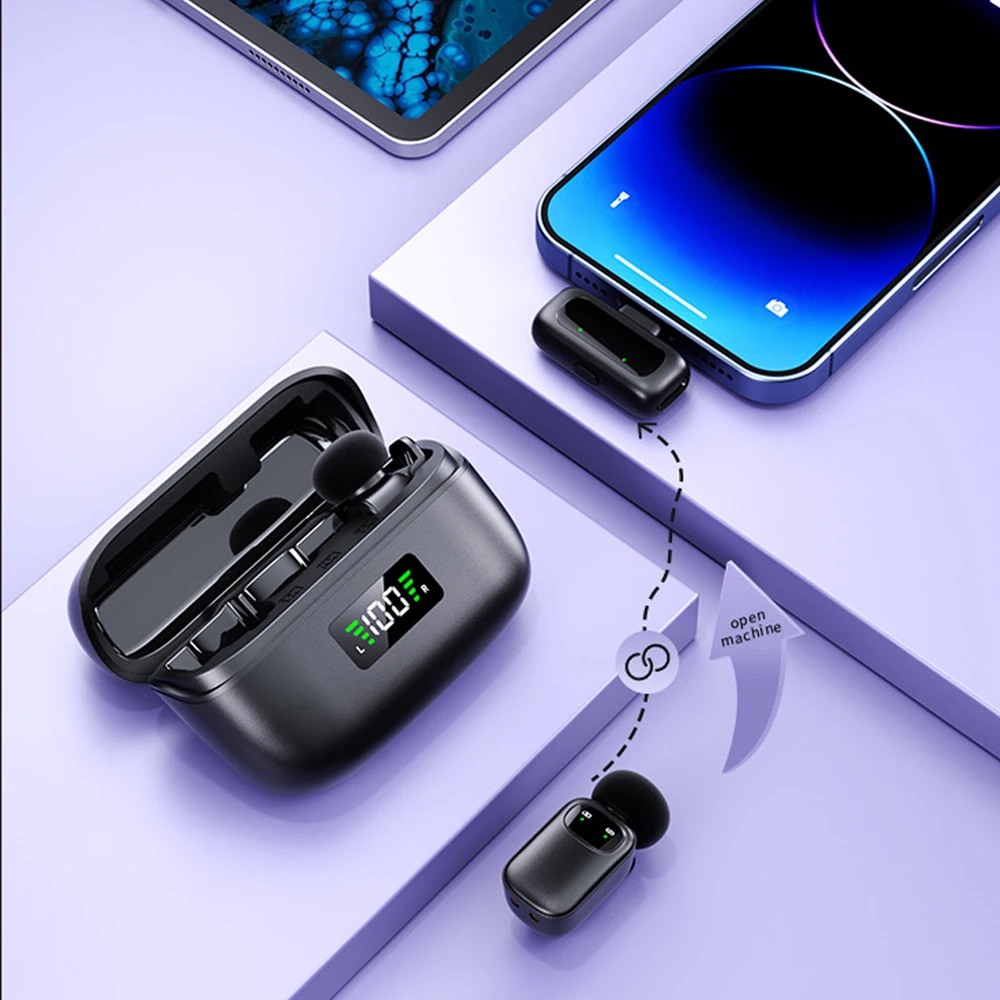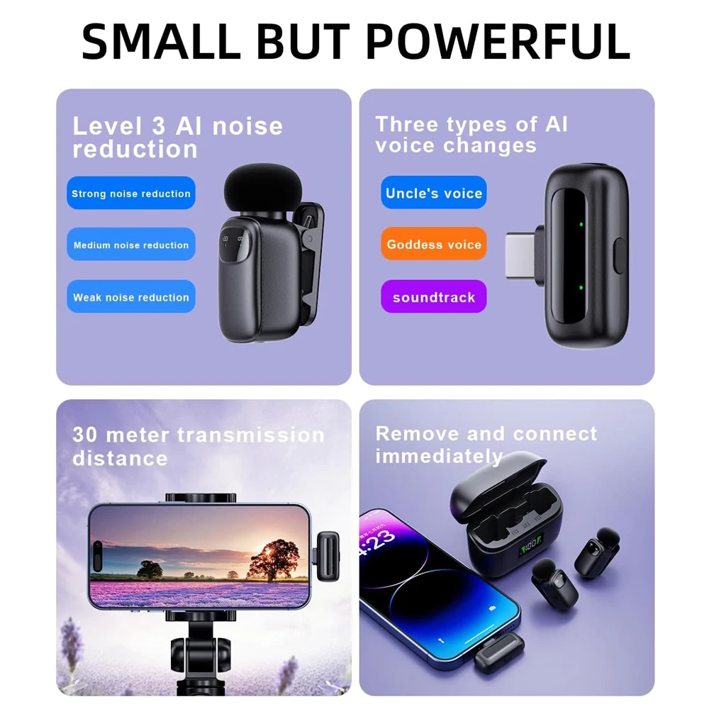 أفضل ميكروفون لاسلكي صغير الحجم وخفيف الوزن، يعمل بتقنية الذكاء الاصطناعي لتقليل الضوضاء بثلاث مستويات، ينقل الصوت حتى 30 مترًا، ويتميز بتأثيرات صوتية متنوعة، مثالي للبث والاجتماعات والاستخدام الفوري بدون إعدادات.