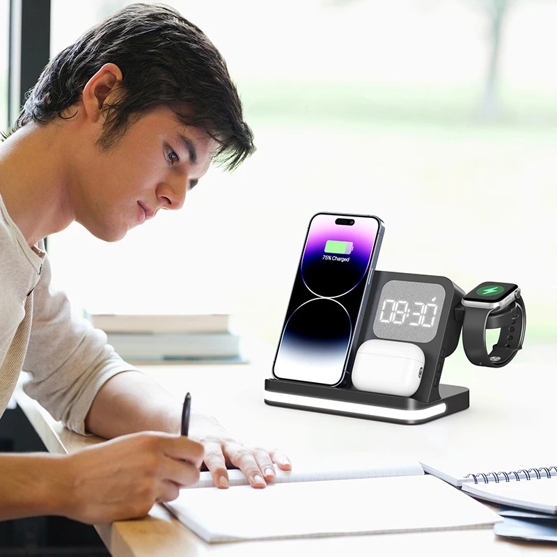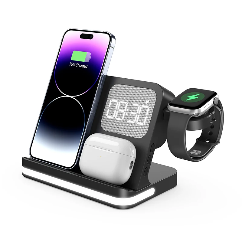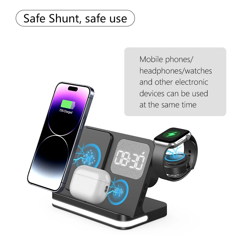 حامل شاحن لاسلكي 3 في 1 يوفر شحنًا آمنًا وسريعًا لعدة أجهزة في وقت واحد مثل الهاتف، السماعات، والساعة الذكية، مع توزيع طاقة ذكي يضمن أداءً فعالًا دون أي خطر على أجهزتك.